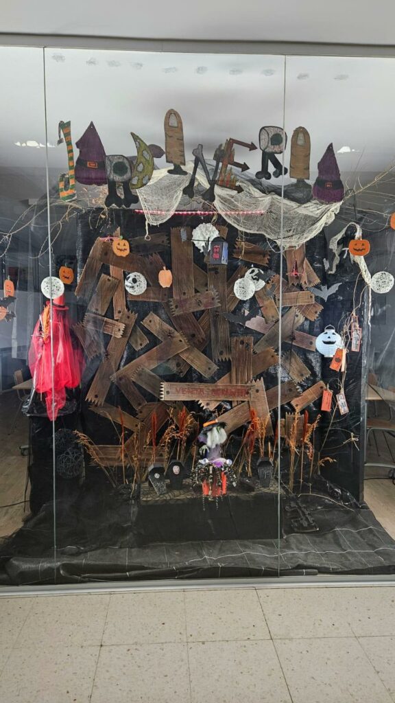 Pero la creatividad no se ha quedado solo en el escaparate. En el edificio principal del centro, el alumnado también ha montado una preciosa tienda con motivos otoñales y de Halloween, donde se han puesto a la venta productos elaborados a mano: adornos, centros, golosinas decorativas y pequeños detalles hechos con mimo y dedicación. La recaudación obtenida se destinará a financiar las salidas y actividades complementarias que el grupo realiza a lo largo del curso.