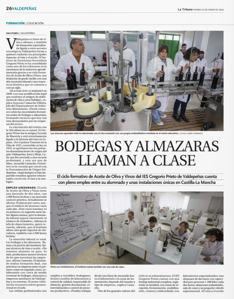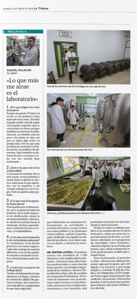 Publicado el 24 enero, 2026 por Departamento Industrias AlimentariasAyer se publicó un reportaje en la edición papel y digital de La Tribuna sobre la oferta formativa de Industrias Alimentarias en el IES Gregorio Prieto. https://latribunadeciudadreal.promecal.es