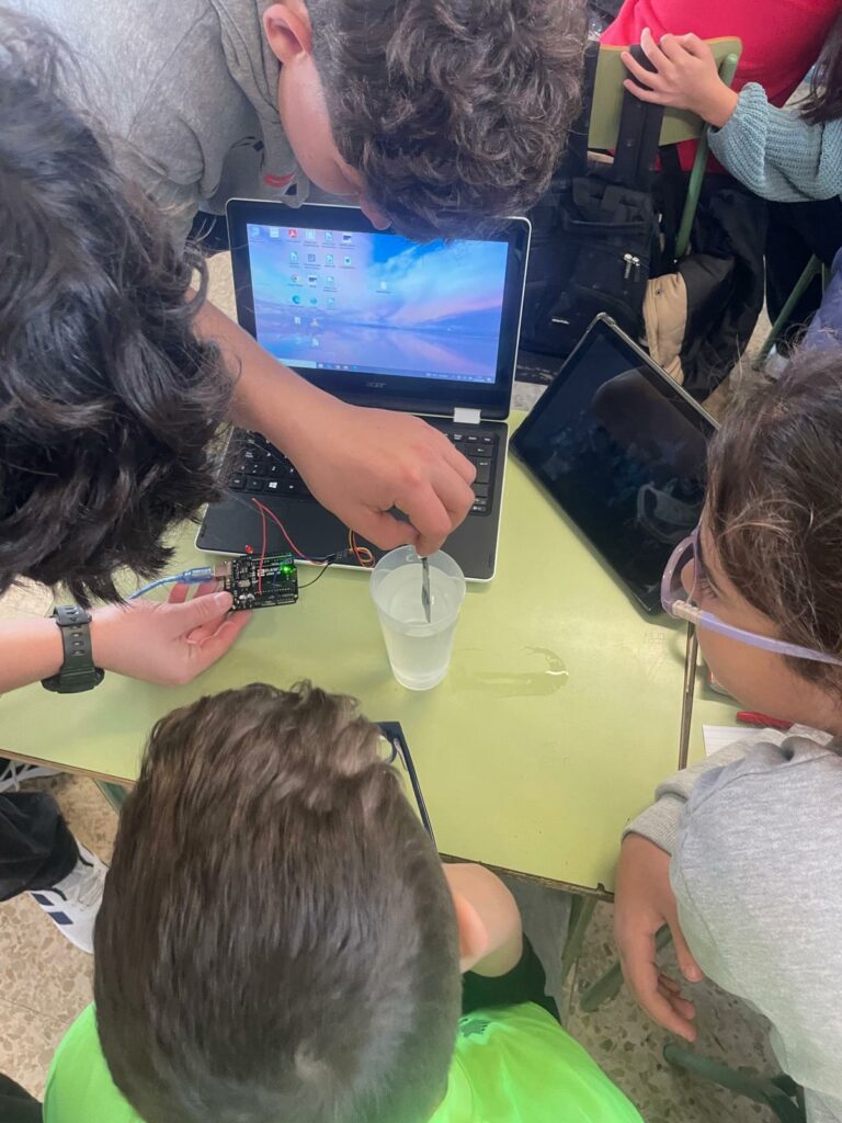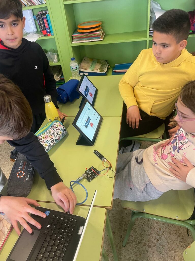 En esta actividad nuestro alumnado enseñó al alumnado de 5º curso del CEIP a programar una placa de Arduino para automatizar el riego del huerto del CEIP.