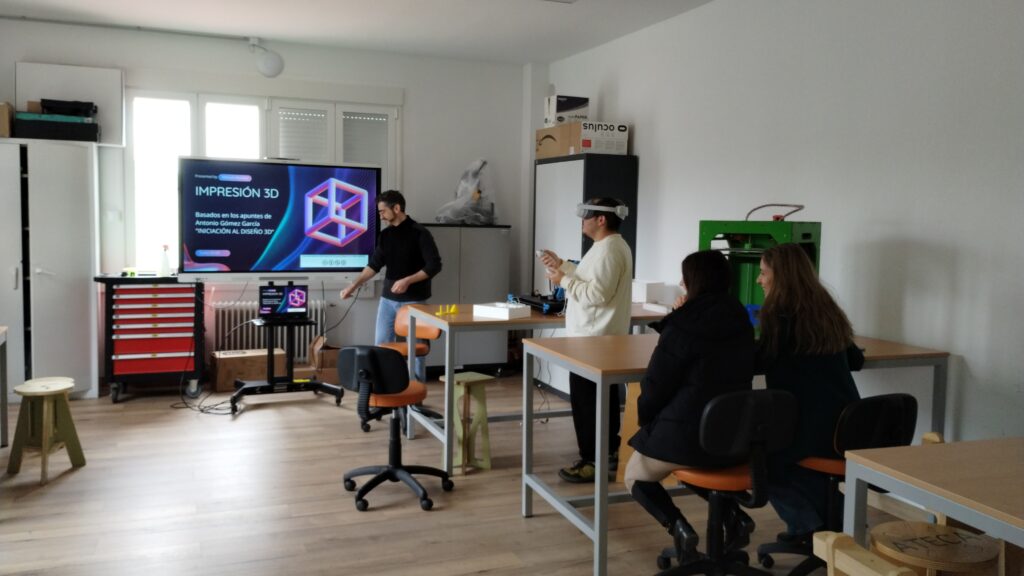 A lo largo de las sesiones, el profesorado tuvo la oportunidad de explorar, manipular y experimentar de primera mano con un amplio catálogo de dispositivos: Gafas XR / Realidad Mixta (HoloLens 2, Meta Quest 3S, Quest 2, HP Reverb G2, Pico 4 Pro Enterprise), Impresión 3D (Manejo de impresoras FDM, laminado, preparación de archivos y resolución de incidencias), Diseño 3D (modelado y preparación de piezas para fabricación digital e integración en entornos XR), Brazo robótico Nyrio Ned (programación, calibración y aplicaciones educativas del robot colaborativo Ned de Niryo), Cámara 360° Insta360 X4