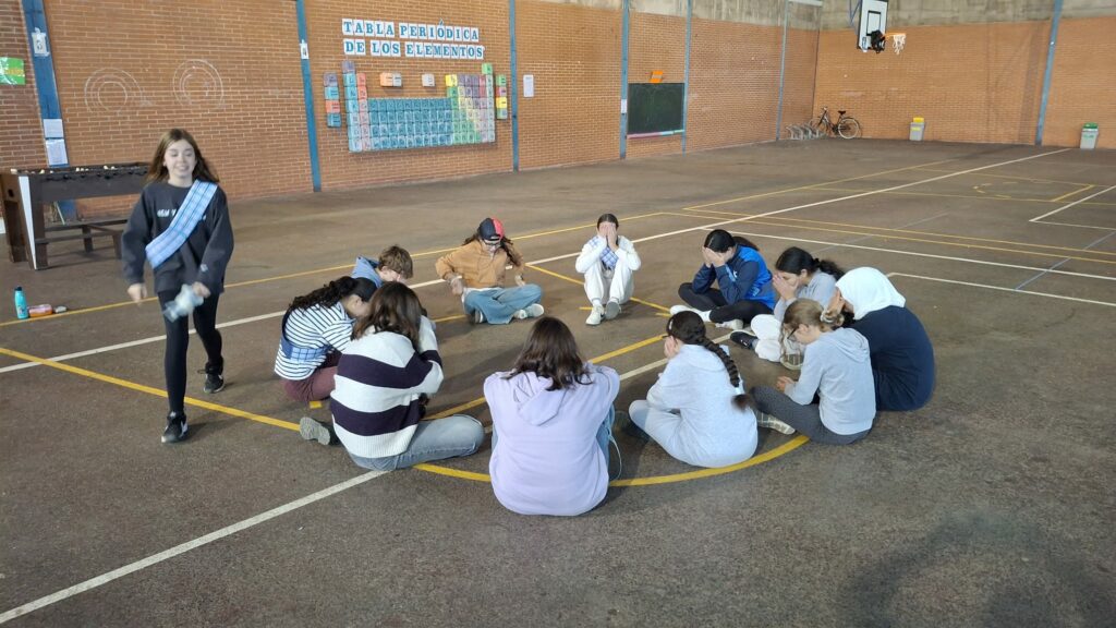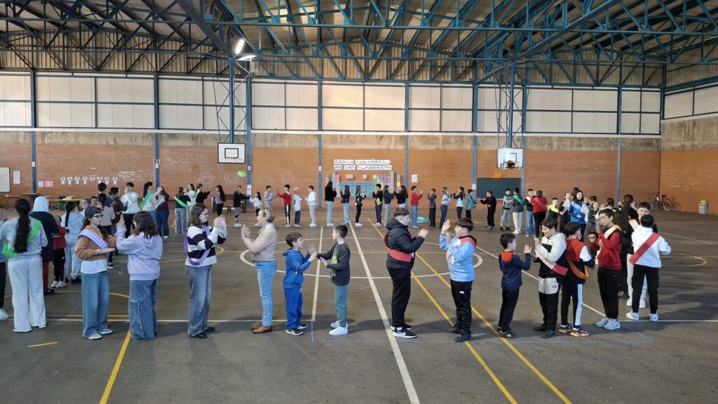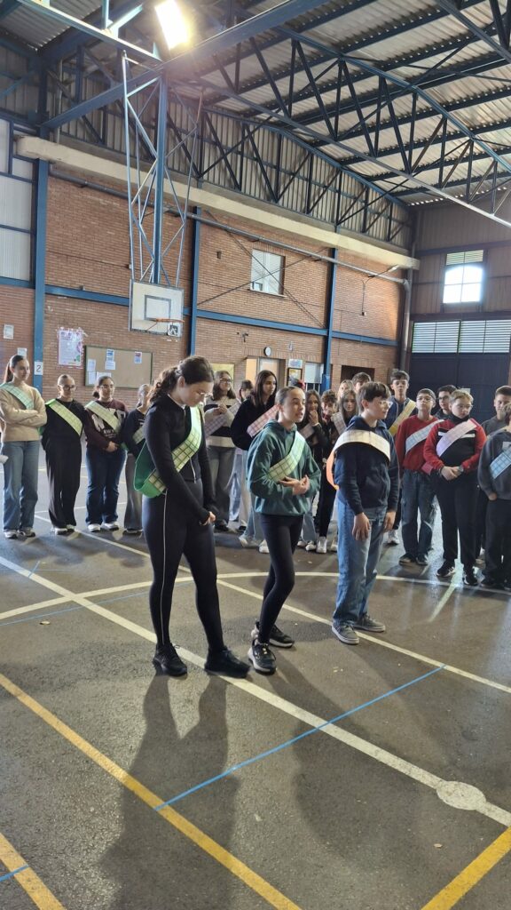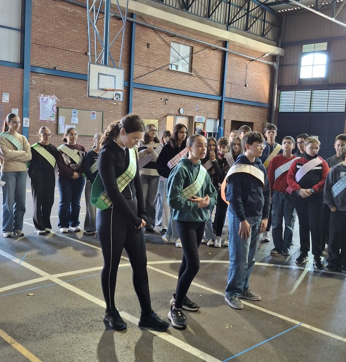 El alumnado de Secundaria ha enseñado los pasos de la danza escocesa Shetland wedding al alumnado de primaria, y después todos juntos, han interpretado esta coreografía en gran grupo. Los participantes de Primaria han seguido el ritmo con entusiasmo, creando un momento lleno de energía y diversión.