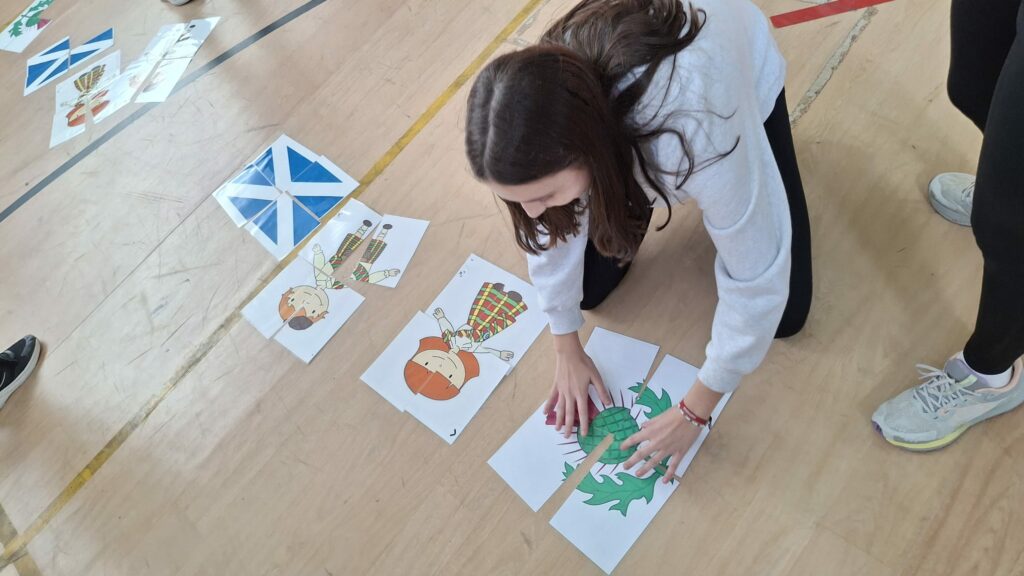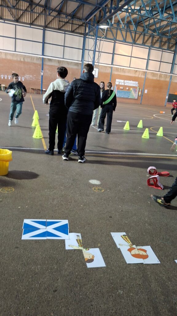 Aportación cultural desde el departamento de Inglés: La profesora de inglés ha aportado información cultural sobre Escocia, sus tradiciones y el significado de Saint Andrew’s Day. Además, ha acompañado y supervisado las explicaciones del alumnado de ESO, ayudándoles a transmitir en inglés las instrucciones de los juegos y de la danza a los estudiantes de Primaria.